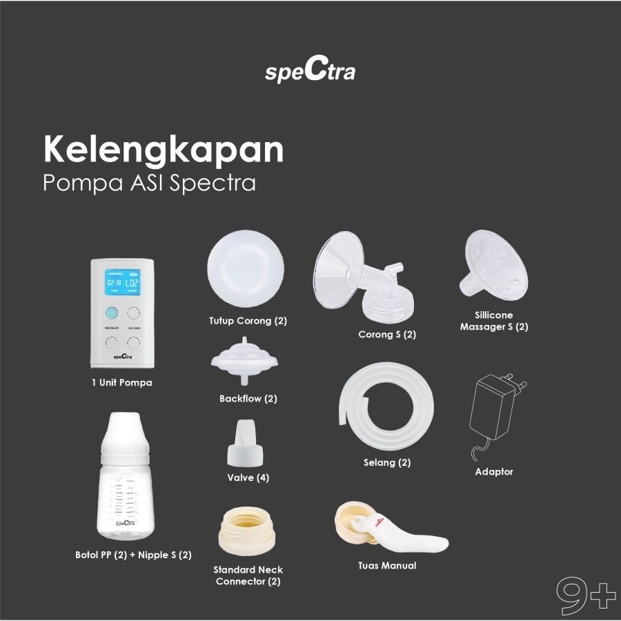 Kelengkapan : • 1 unit unit pompa • 1 pc adaptor • 2 pcs corong berukuran S • 2 pcs backflow • 2 pcs silicone massager S • 4 pcs valve • 2 pcs tutup corong • 2 pcs selang • 2 pcs tatakan botol • 2 pcs botol PP • 2 pcs standard neck connector • 1 pc tuas manual Fitur massage atau stimulasi yang berguna untuk merangsang Let Down Reflex pada payudara.